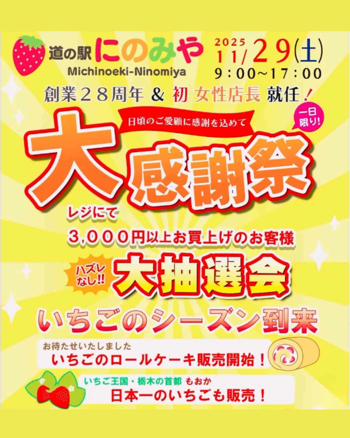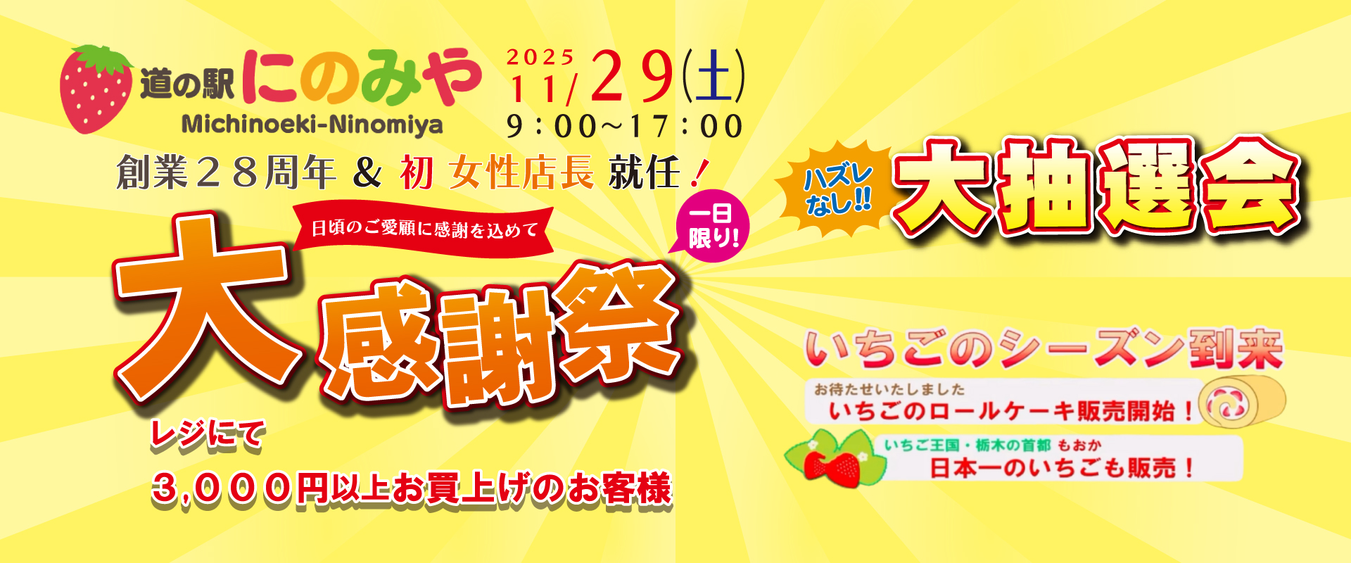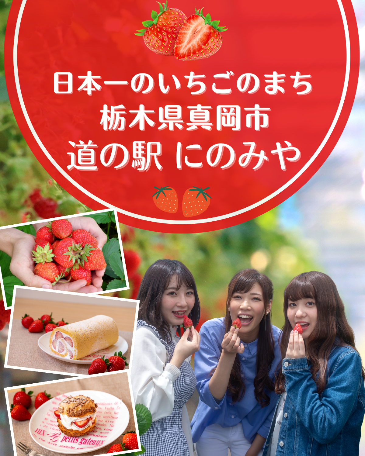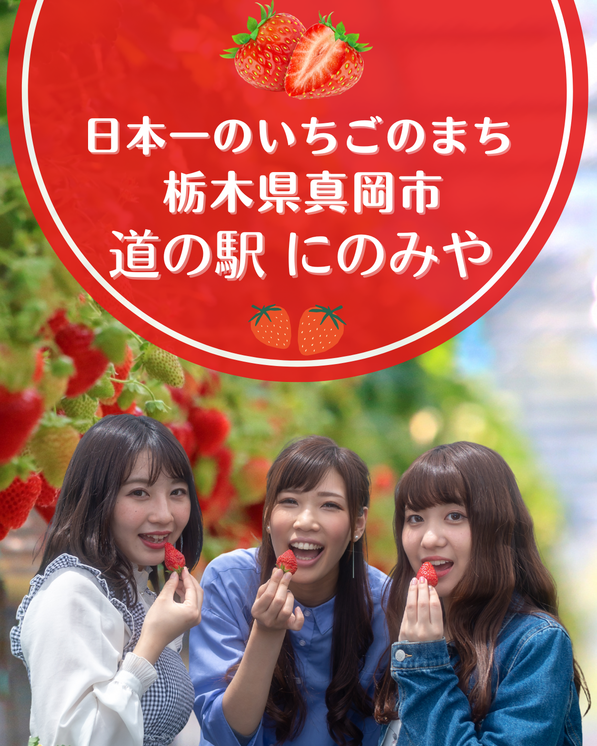道の駅にのみやは栃木県で2番目に設立された道の駅で、真岡市と二宮町が合併する以前より運営しています。 現在では年間30万人と大変多くのお客様にご来場いただいています。お客様に便利にご利用いただけるよう、駐車場は約60台ご用意しており大型バスも駐車できます。 いちごや農産の直売所、農産物部会には130人会員がおり、そのうちの5分の1の20人強がいちご農家です。年間を通じて新鮮ないちごを提供しており、春夏秋の時期はなつおとめ、冬の時期はとちおとめをお楽しみいただけます。