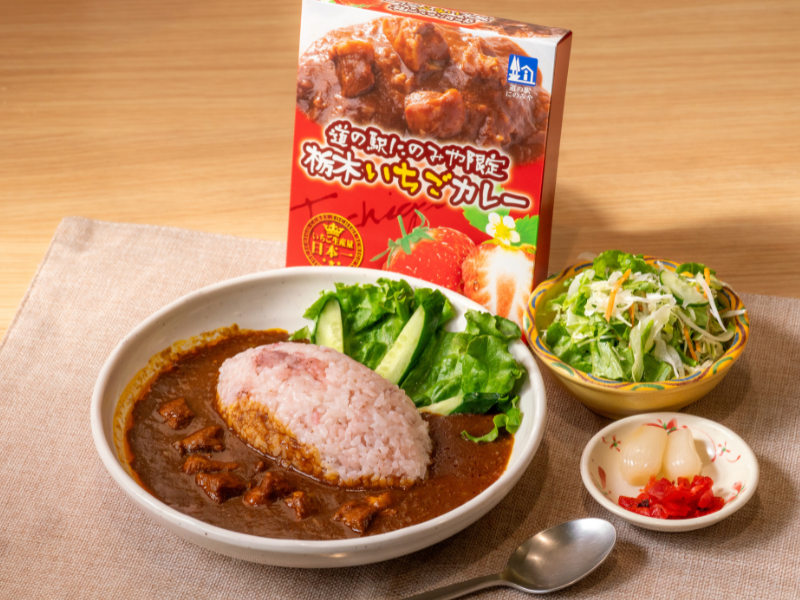 道の駅にのみや限定! 真岡市の名産いちごを隠し味に加えた、ちょっと意外でクセになる“いちごカレー”。 いちごの甘みとほのかな酸味がスパイスの辛さをまろやかにまとめ、深みのある味わいに仕上がっています。